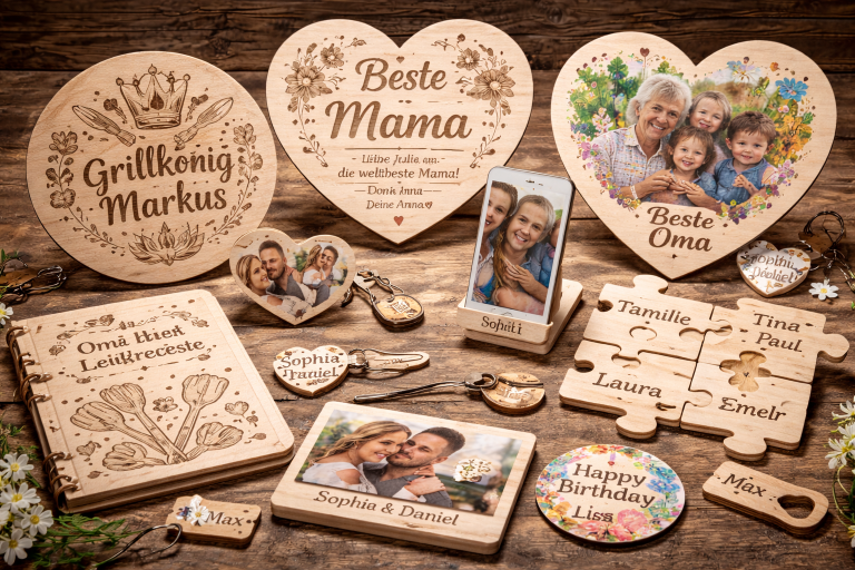Gestalten Sie Ihr ganz persönliches Geschenk mit meinen hochwertigen Holzgravuren, Sublimationsdruck, Textilveredelung und mehr!